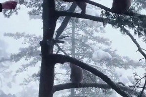 雪后黄山,猴子集体蹲坐树上,被投喂时温顺乖巧