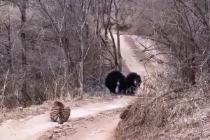 黑熊遇虎:大虎屹立不动,双熊落荒而逃